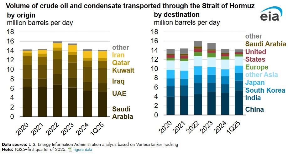 As of this writing, major shipping and tanker operations have suspended transit through the Strait of Hormuz due to the war with Iran. However, when it comes to the immediate impact of this closure on the U.S. economy, it’s important to remember that the United States is a net exporter of oil and is far less reliant on Middle Eastern oil imports than it was decades ago. The chart below helps to illustrate this by showing the sources and recipients of oil transported through the Strait of Hormuz each day. As you can see on the right side of this chart, countries like China and India are far more reliant on oil from the Middle East than the United States.