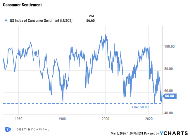 Furthermore, if the past few years have taught us anything, it’s that inflation can be incredibly detrimental to consumer mindset. As aggregate prices rise, we tend to see U.S. consumers grow increasingly pessimistic about the economy, and this can be seen in the chart below that tracks consumer sentiment since the early 1950’s. As you can see, consumer sentiment fell to an all-time low in June of 2022 as inflation surged over 9%, and consumer sentiment has declined once again in recent months as shelter, food and utility prices have remained stubbornly high.
