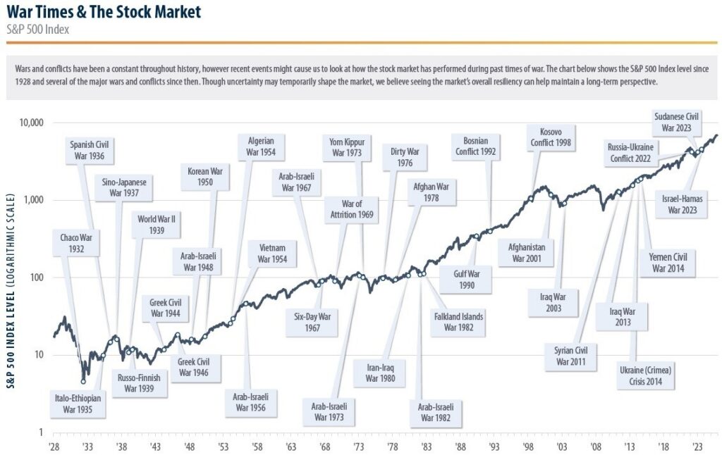 It’s an unfortunate fact that investors have endured many geopolitical conflicts over the decades. The chart below helps to demonstrate this by illustrating the upward trajectory of the S&P 500 despite consistent geopolitical disruption. This serves as a reassuring reminder that the stock market has remained incredibly resilient over time and investors have been rewarded despite periods of elevated risk and volatility like we see today.