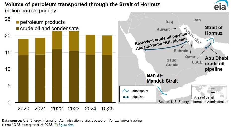 When it comes to the near-term impact for financial markets and the economy overall, it’s impossible to talk about war in the Middle East and not consider the impact on a vital commodity like oil. Iran isn’t necessarily a major player when it comes to oil exports these days, as the country only accounts for roughly 4% of global oil supply. However, geographically speaking, Iran is a major player when it comes to the transportation of oil given the crucial importance of the Strait of Hormuz which is a choke point in the Persian Gulf that runs between southern Iran and northern Oman. As you can see in the graph below, roughly 20 million barrels of petroleum are moved through the Strait of Hormuz each day, which represents about 20% of the global oil supply.