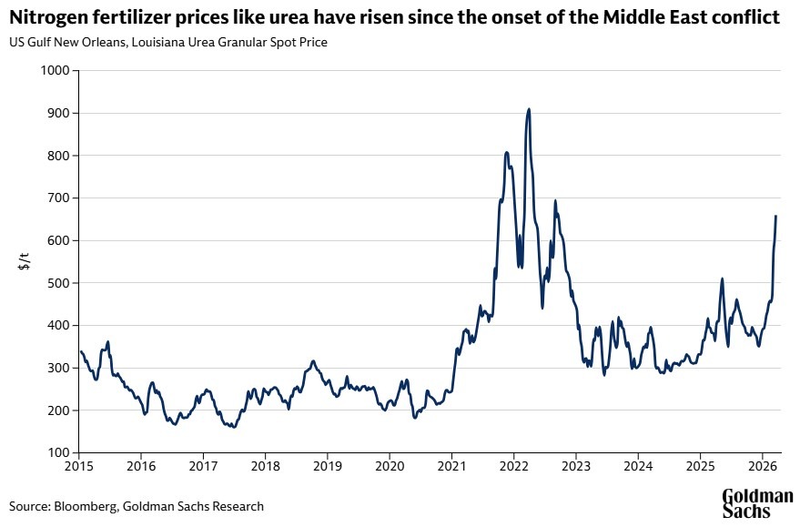 However, in recent weeks, additional concerns have emerged due to the closure of the Strait of Hormuz, and these concerns deal with the disruption to the global fertilizer supply. Fertilizer requires energy-intensive production, and much of the world’s fertilizer supply is produced in the Middle East, with roughly one-third of global fertilizer trade typically passing through the Strait of Hormuz. Therefore, the increasingly lengthy closure has sent fertilizer prices soaring, as you can see in the chart below from Goldman Sachs.