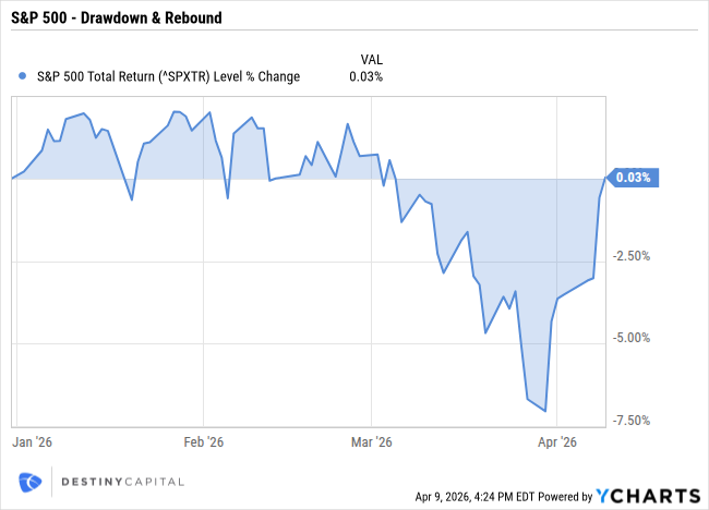 At Destiny Capital, one of our firm’s core values is ‘Adaptability’. Being adaptive is vital given the pace of change we see not only across our industry, but across the economy overall. For many, however, the recent pace of change can be unsettling, and can cause an individual to become reactive, and we’ve seen this dynamic in financial markets over the past few months. You can see this in the chart below that shows wild swings in the trajectory of the S&P 500 since the beginning of the year as rapid change has led to elevated uncertainty.