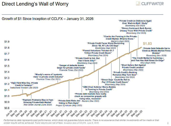 Those five headlines alone are enough to make me want to crawl under my desk and re-emerge a month from now. With constant headlines like those above, it’s not surprising that investors have seen volatility spike in each of these assets. Is this worry and volatility warranted? Well, in this month’s letter, we’ll attempt to address that question for two important assets – private credit and software stocks.