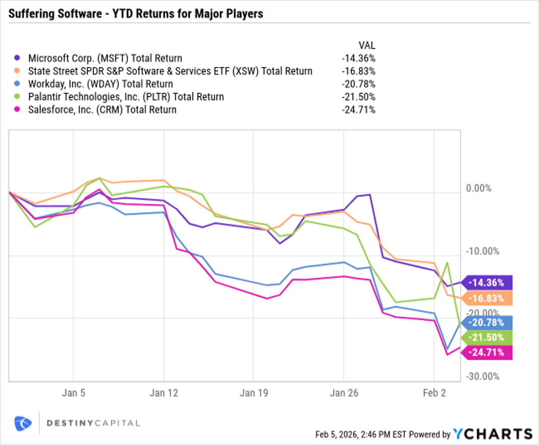 Over the past few weeks, we started to see potential disruption in action when AI company Anthropic released an advanced version of its Claude AI model (ex. Claude Opus 4.6) that possesses advanced capabilities in coding, analysis, and autonomous task execution. This model could potentially automate work that is traditionally executed by humans, facilitate legal review & document analysis, and much more. In short, investors immediately viewed this as a threat to traditional software as a service (SaaS) companies, and the route was on for software companies like Microsoft, Workday, Salesforce, Palantir, and many others as you can see in the chart below.