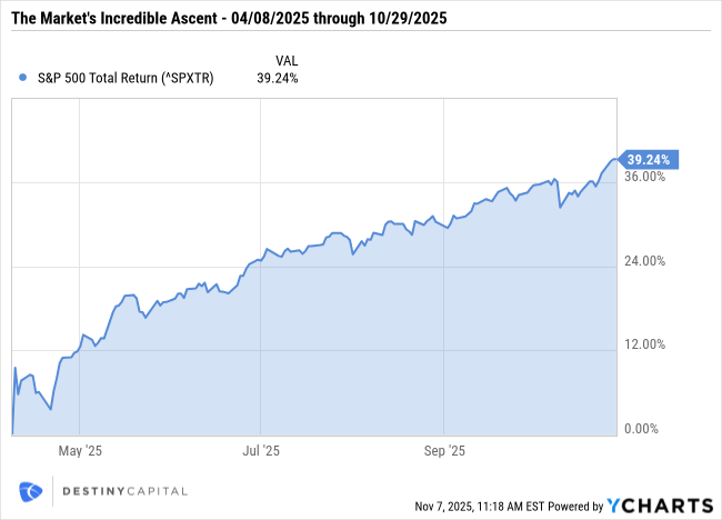 While watching stocks lose ground is never fun, it’s also important to note that the S&P 500 had been on a torrid ascent ever since the Trump administration walked back some of the steep tariffs announced on ‘Liberation Day’ in early April. In fact, since the market lows on April 8th, the S&P 500 Index climbed a staggering 39% in just a few short months, as seen below.